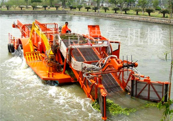 割草船是一種集割草、聚攏、打撈、濾水、輸送、卸載等于一體的現代化水草、水葫蘆收割設備。所有操作程序采用全液壓控制,簡單、方便、靈活,是城市水面景區不可或缺的保潔設備,也可作為垃圾清理船、湖面保潔船均收到良好的效果。